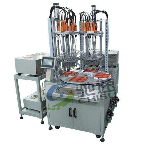 雙鎖付系統主要是針對螺絲密集的產品設計,一些產品螺絲孔間距較小,無法實現一次擰好所有螺絲,雙鎖付系統可將密集的螺絲分兩次完成,通過轉臺流水作業,達到一次擰好所有螺絲的效果。